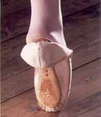 Als nächste mit einem Fuß auf Spitze stehen ohne ihn zu sehr zu belasten. So kann erst mal die Breite überprüft werden in dem man sich die Sohle betrachtet. Diese sollte Flach an der Ferse anliegen. Wenn sie verdreht ist, ist der Schuh zu eng. Auch nochmals überprüfen ob die Box die Zehgelenke richtig umfasst.